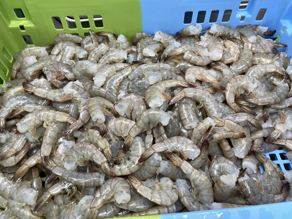 ブロックエビは流水解凍と比較すると2~3%、温塩水解凍と比較すると1~2%の歩留まりの改善に繋がりました。